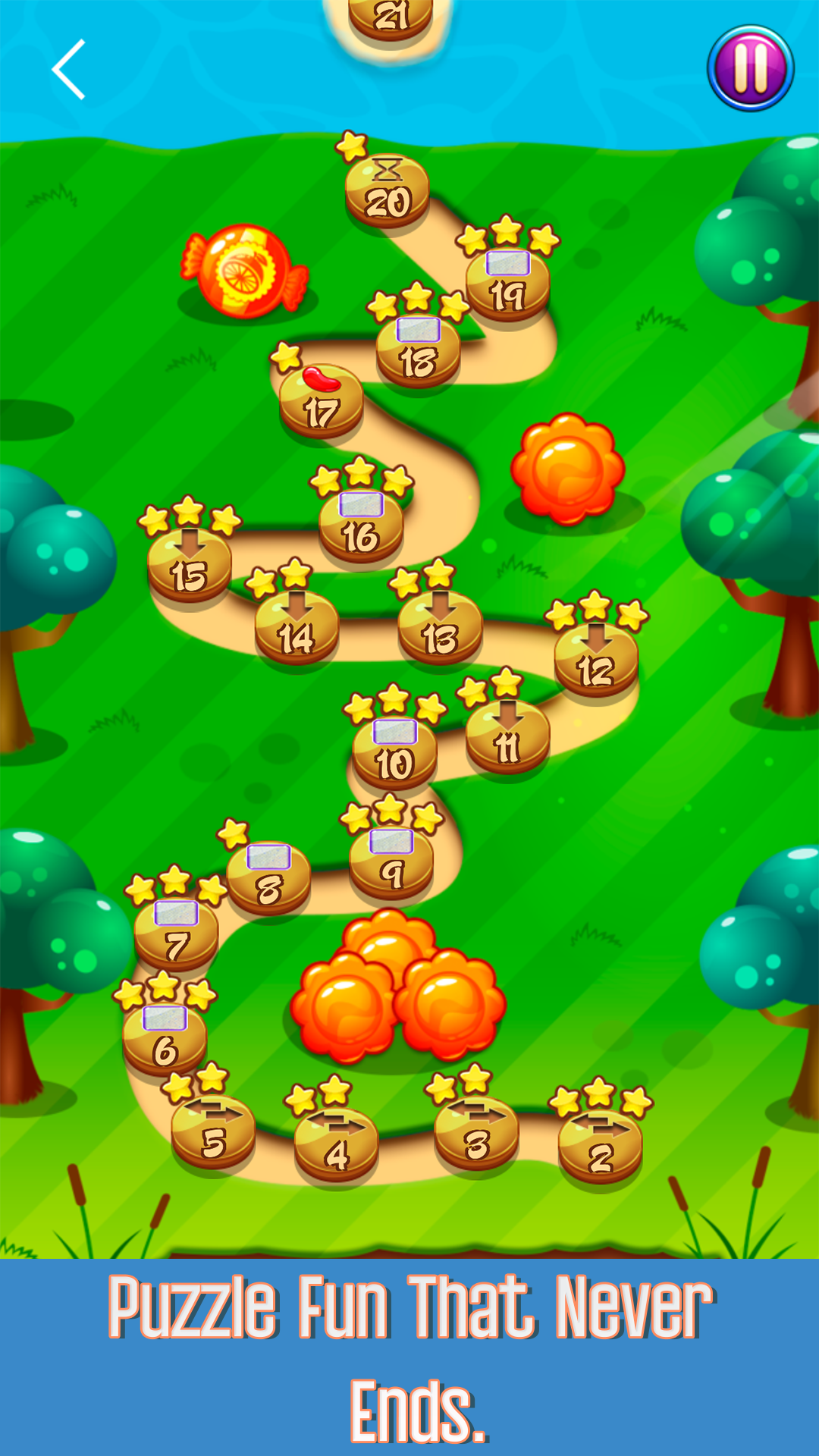 -Explore a magical candy world full of fruit, jewels, and sweet treats.