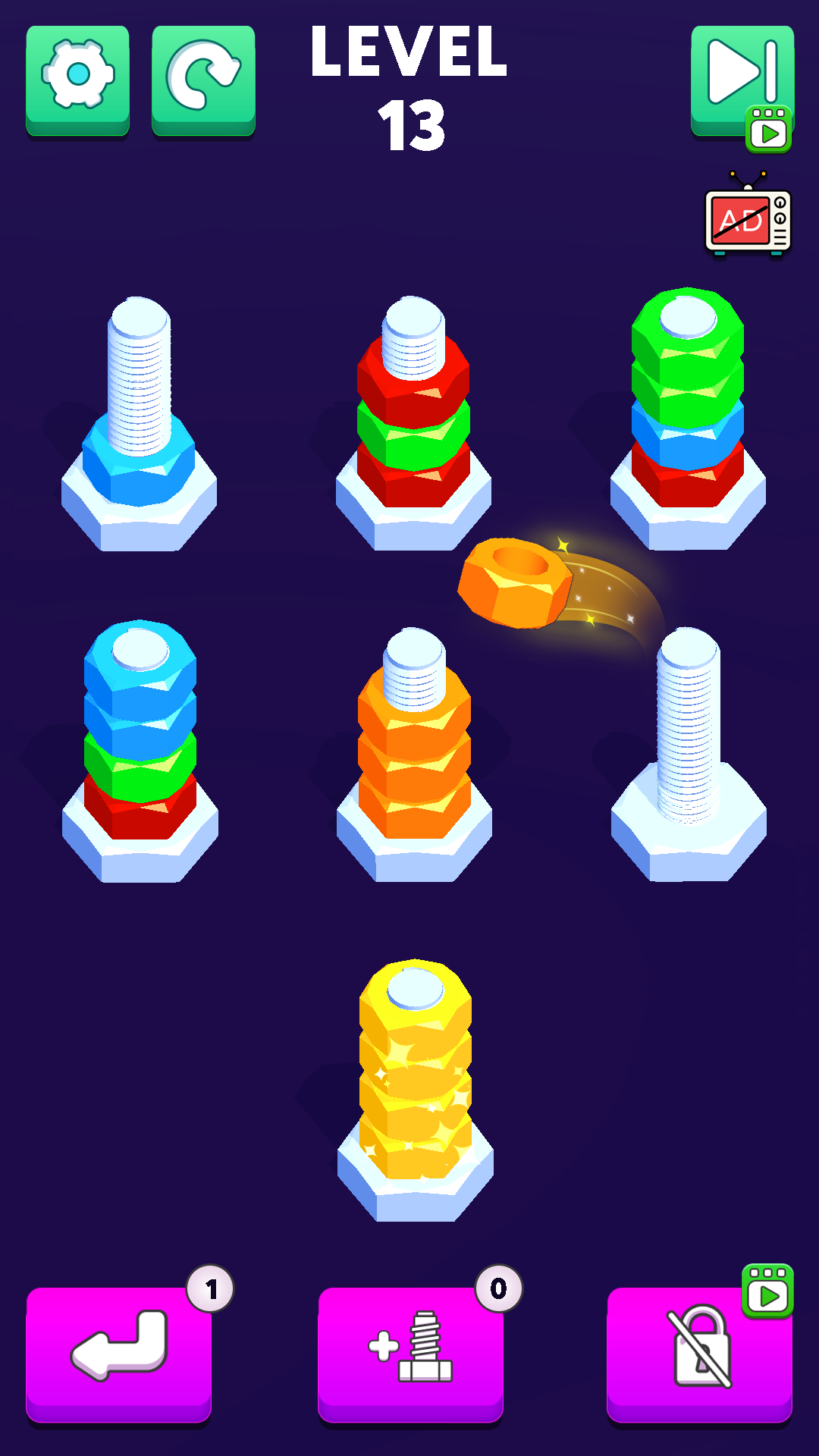 Nut Sort 3D is more than just a bolt sort game—it's a test of precision and speed! Engage in the nuts challenge by sorting through a crazy collection of color bolts and color nuts that will keep you hooked. Use your skills to conquer the nut sort puzzle, mastering how to handle tricky combinations and variations in nut color and bolt dimensions.