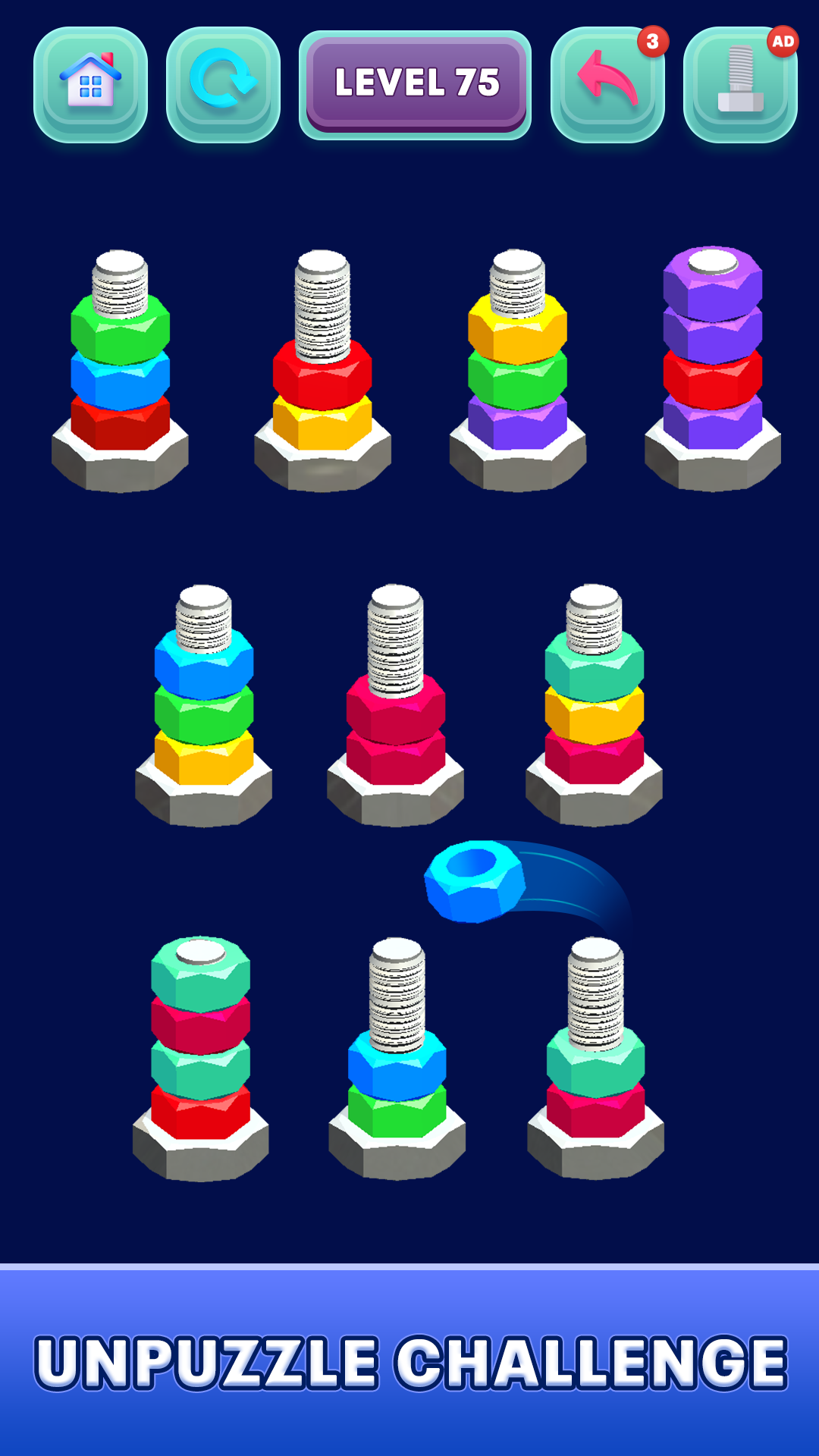 Get ready for the most addictive Nut Sort Game with Nuts and Bolts Jam: Nut Puzzle! If you love color sorting challenges and nuts & bolts puzzles, this game is perfect for you. Test your sorting skills and logic in this engaging nut and bolt sorter designed to challenge your brain with fun and tricky levels.