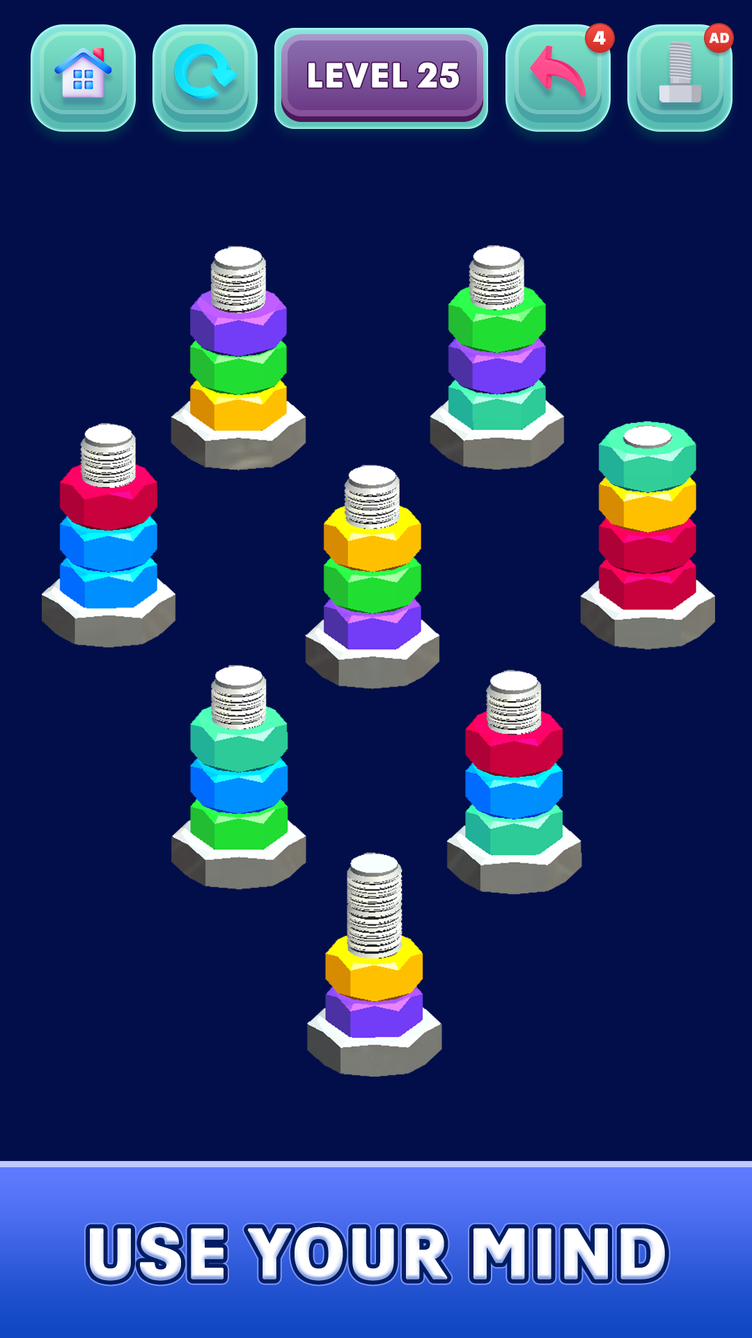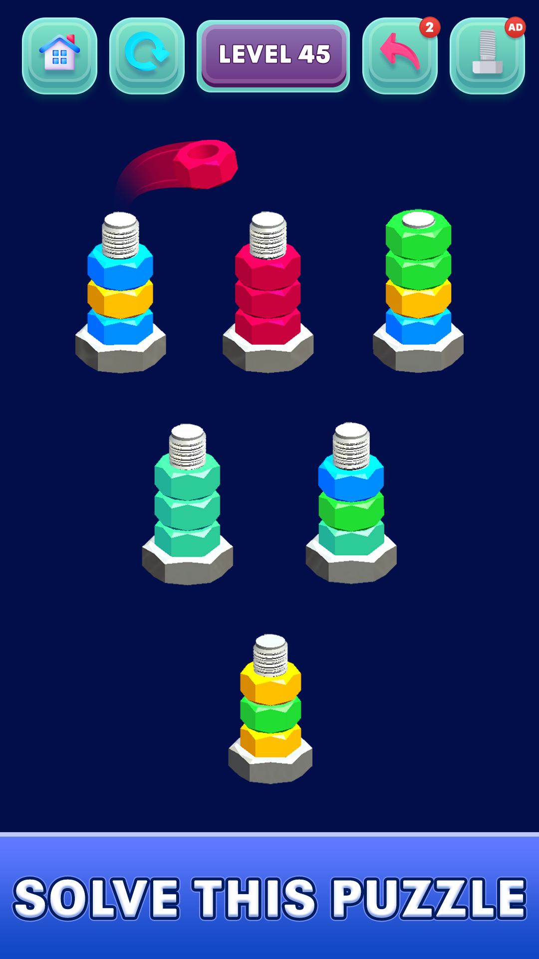 Your goal is simple: sort puzzle pieces by matching the correct nuts and bolts together. As you progress, the difficulty increases, making this nut sorting game even more exciting. Organize, strategize, and complete each nuts bolts sort challenge as fast as possible!