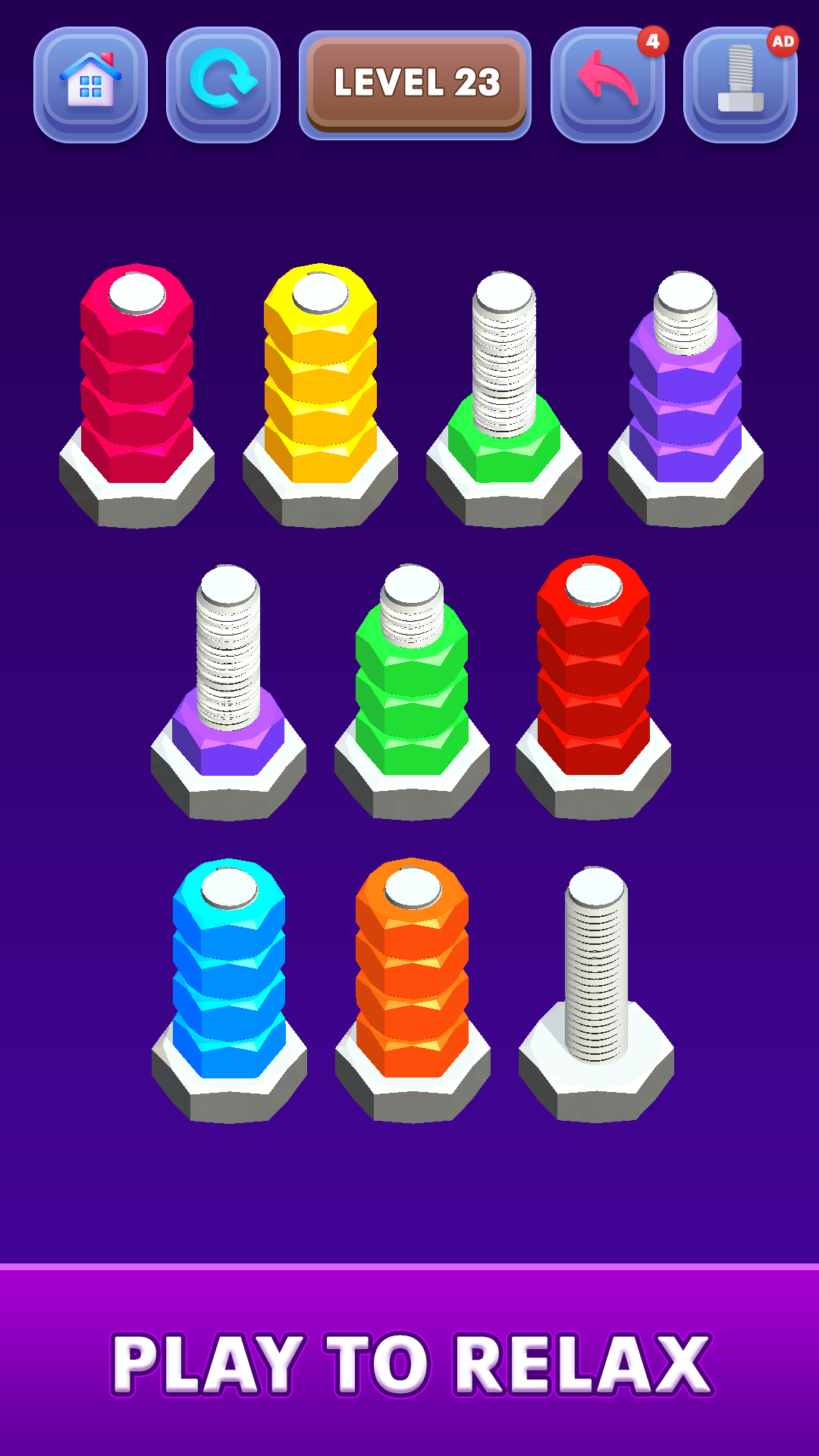 If you're a fan of nuts and bolts sort challenges or looking for a relaxing yet brain-stimulating color sorting game, this Nut Sort Game is for you! Ready to become the ultimate nut and bolt sorter