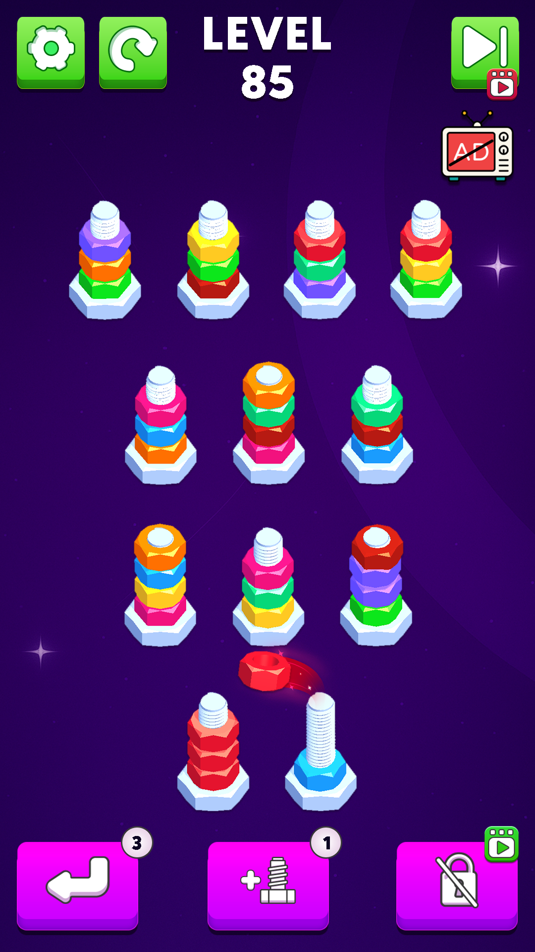 In Nuts Mania, you’ll find a wide variety of nut color variations and bolt types to keep gameplay exciting. Each stage ramps up the difficulty in this thrilling nut and bolt sorting puzzle that combines fun with brain-boosting mechanics. Sharpen your skills in nuts sort puzzle challenges and become the ultimate nuts master by completing every level flawlessly.