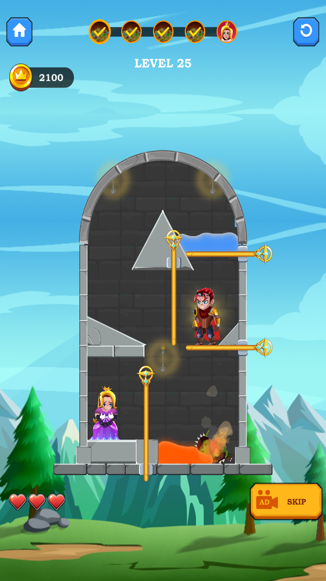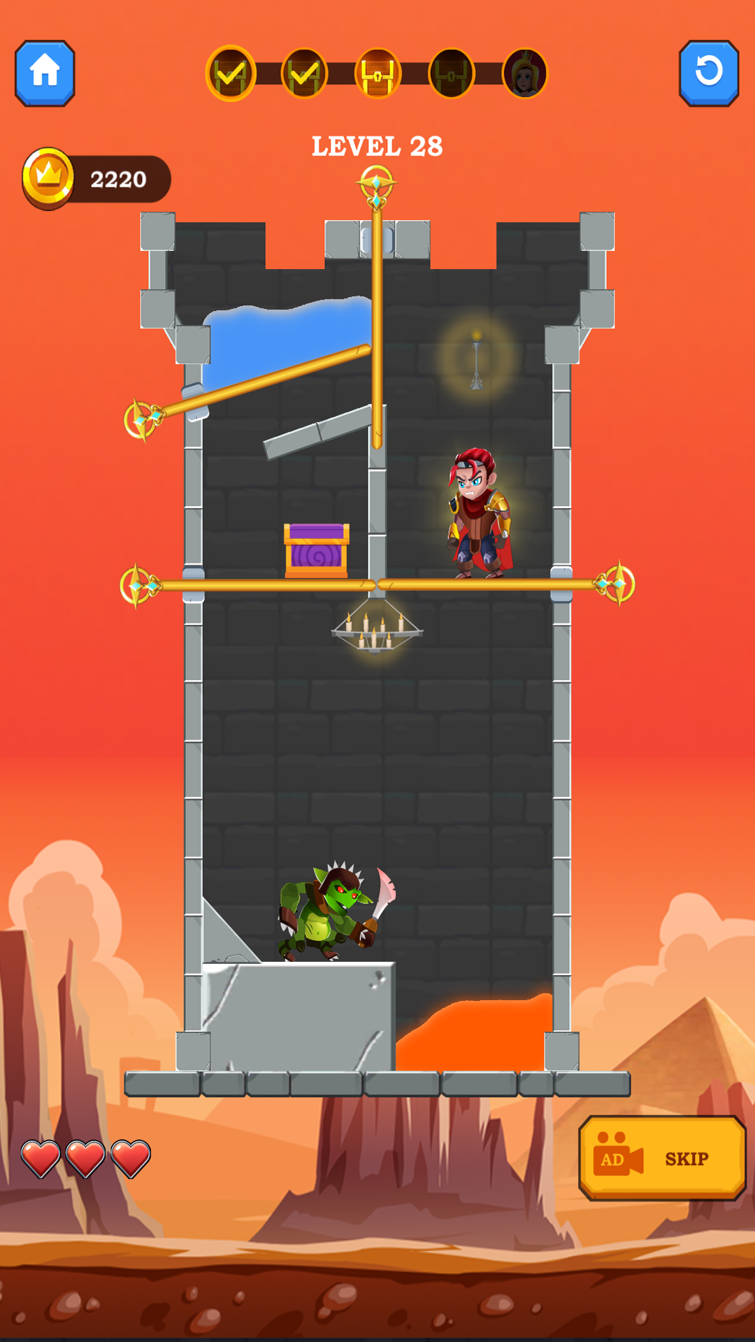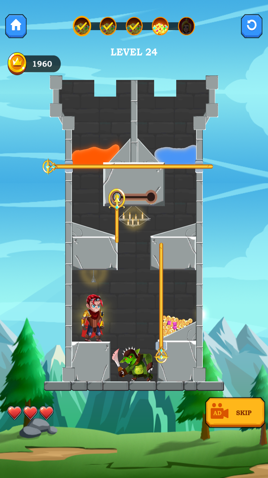 In Rescue Hero: Pull the Pin, you play as a brave Pull the Pin Hero on a daring mission to rescue the princess, recover treasures, and escape dangerous traps. Each level offers a unique Hero Puzzle Game experience that will test your wits. Avoid deadly lava, defeat enemies, unlock hidden rewards, and make smart choices to become the ultimate Hero Rescue Game champion.