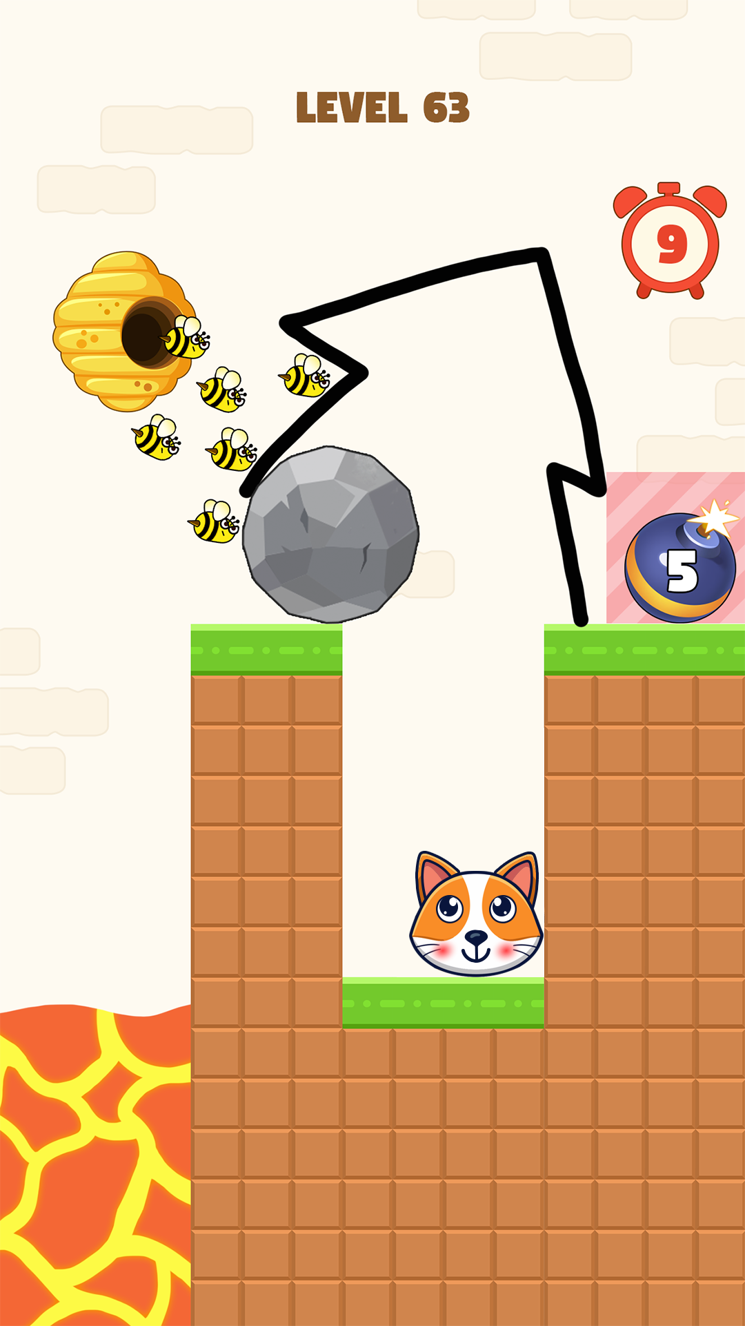 Save the Cat: Draw Line to Save is an addictive brain puzzle game that challenges your creativity and logic as you draw lines to protect adorable pets from danger. If you love brain line games and clever draw line puzzles, this is the ultimate game for you! Your mission is simple but thrilling: save the cat from a swarm of relentless bee attacks by drawing strategic lines that block or divert the buzzing threat.