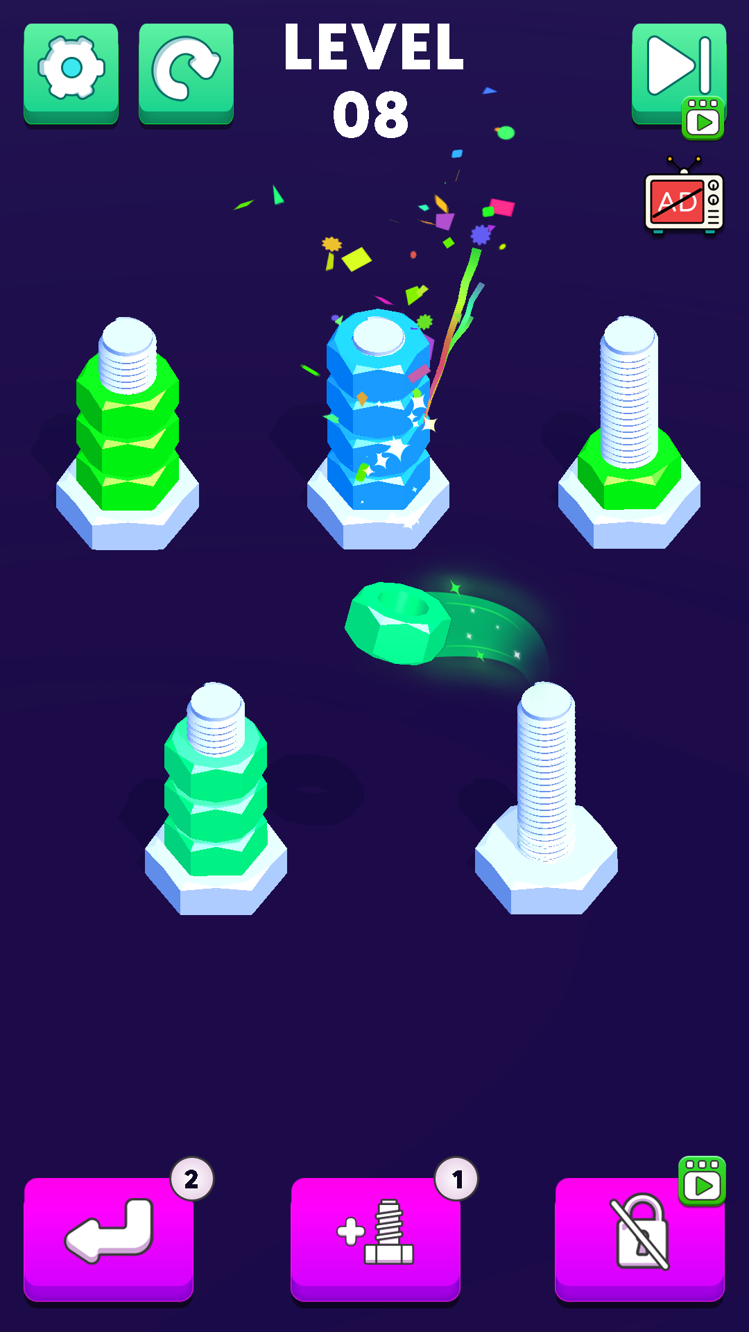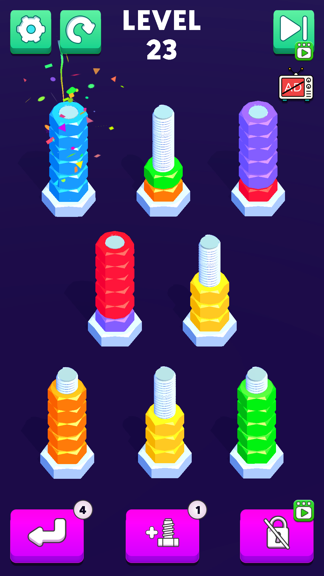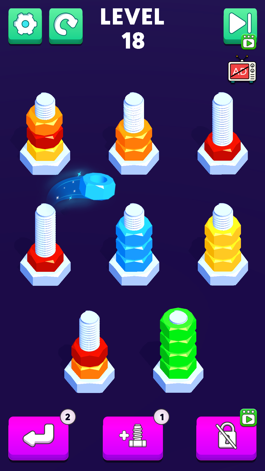 Nut Sort 3D is more than just a bolt sort game—it's a test of precision and speed! Engage in the nuts challenge by sorting through a crazy collection of color bolts and color nuts that will keep you hooked. Use your skills to conquer the nut sort puzzle, mastering how to handle tricky combinations and variations in nut color and bolt dimensions.
