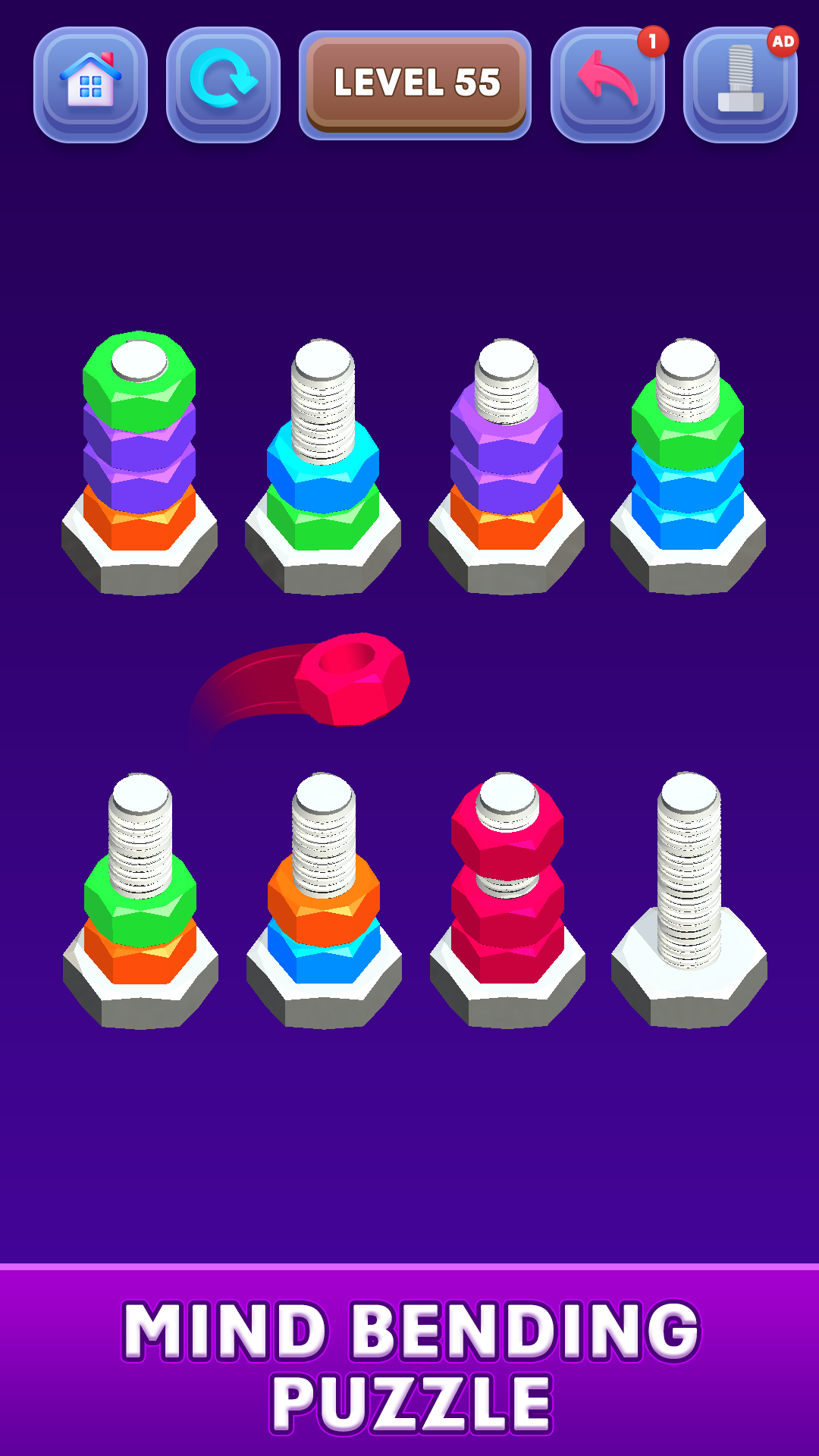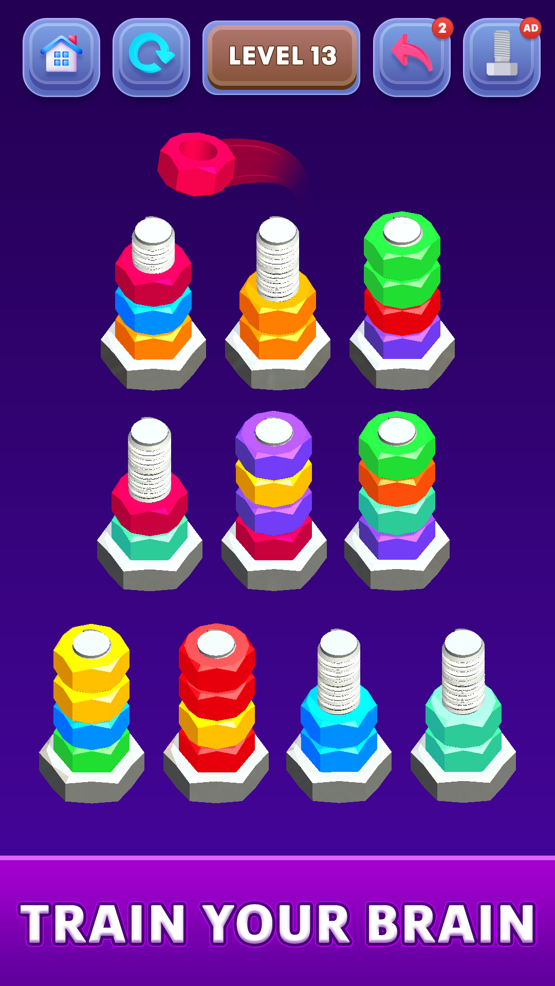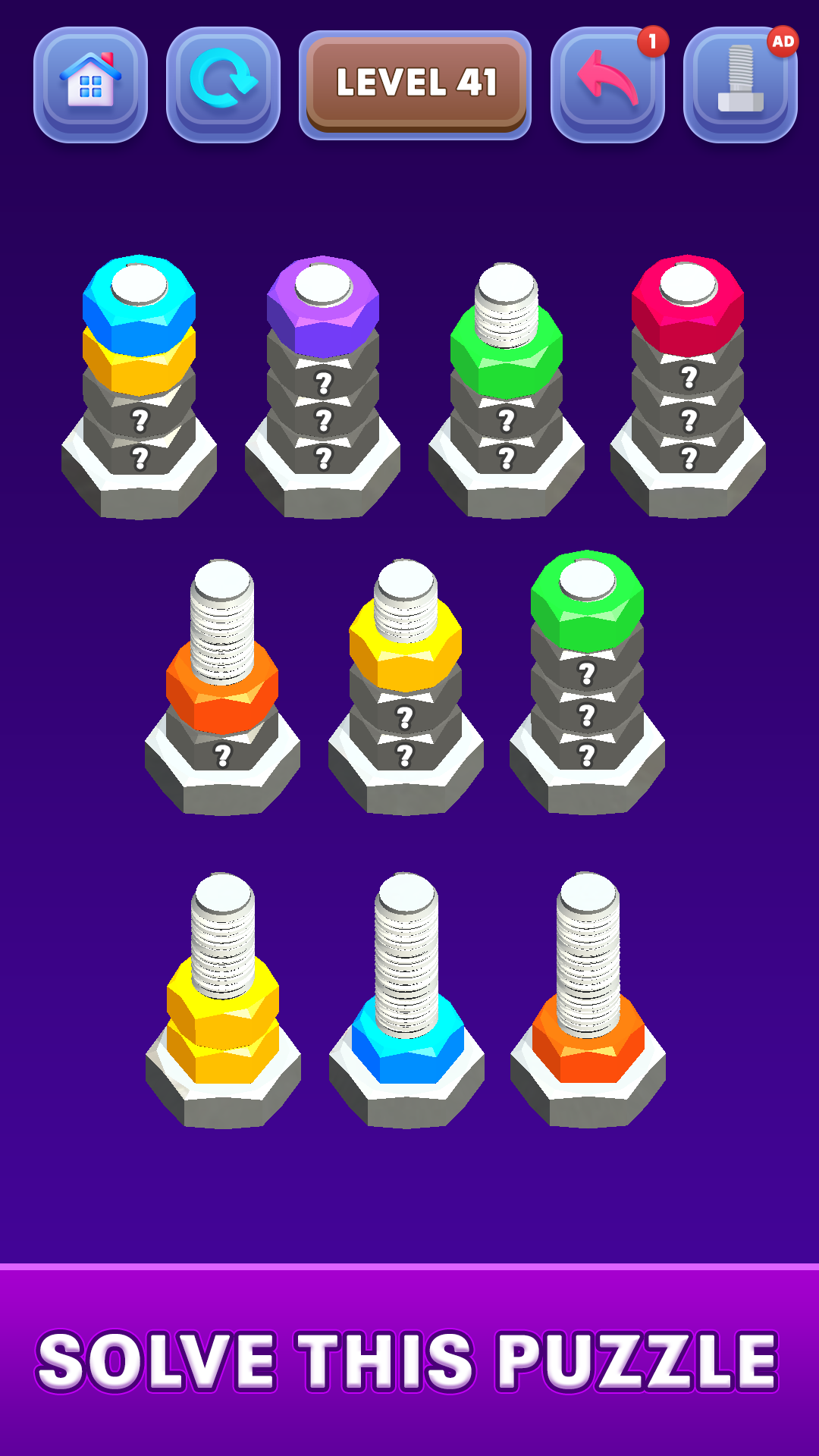 If you're a fan of nuts and bolts sort challenges or looking for a relaxing yet brain-stimulating color sorting game, this Nut Sort Game is for you! Ready to become the ultimate nut and bolt sorter