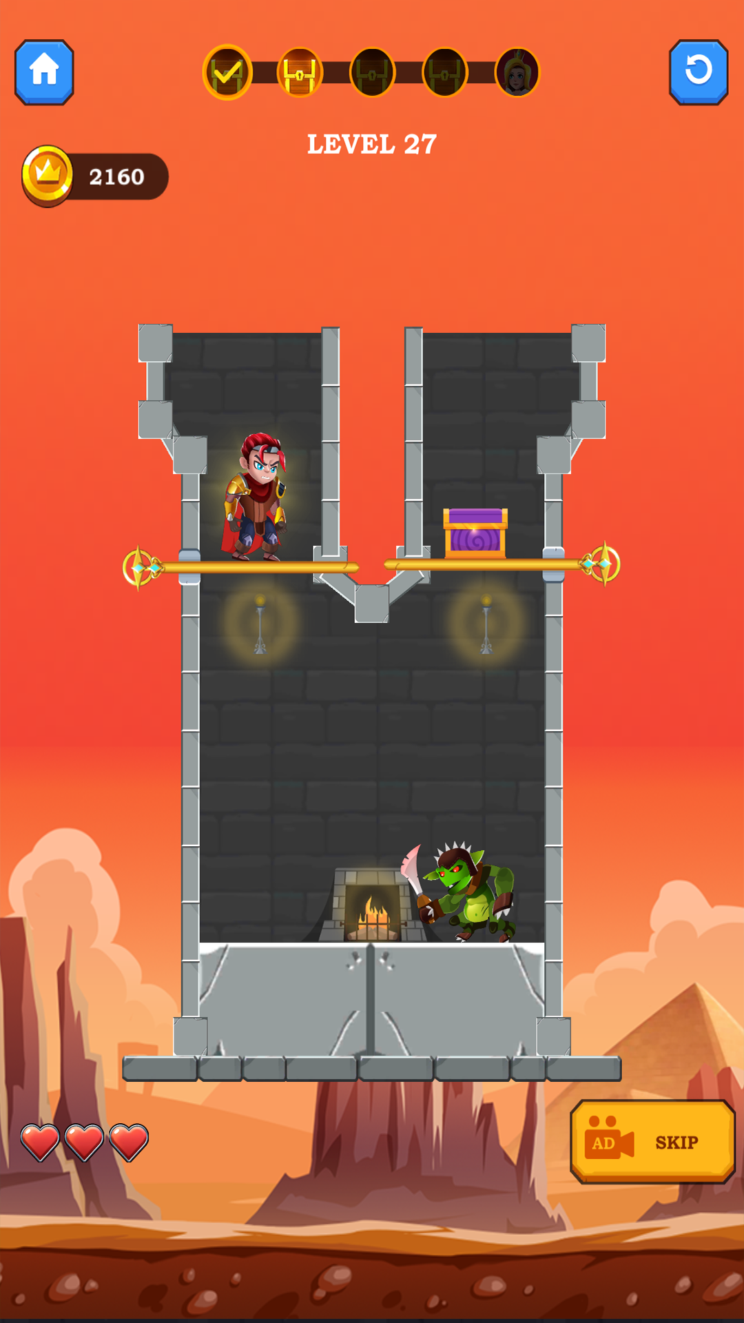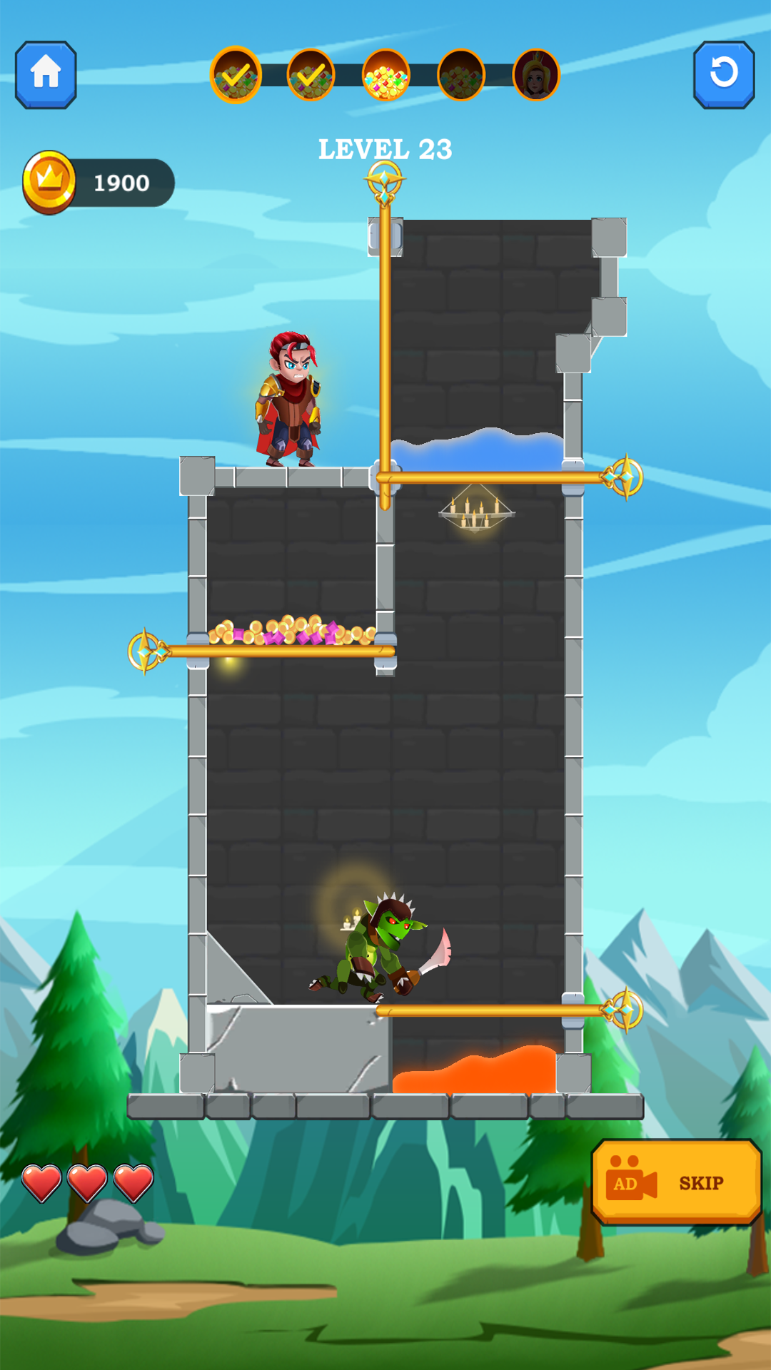 In Rescue Hero: Pull the Pin, you play as a brave Pull the Pin Hero on a daring mission to rescue the princess, recover treasures, and escape dangerous traps. Each level offers a unique Hero Puzzle Game experience that will test your wits. Avoid deadly lava, defeat enemies, unlock hidden rewards, and make smart choices to become the ultimate Hero Rescue Game champion.